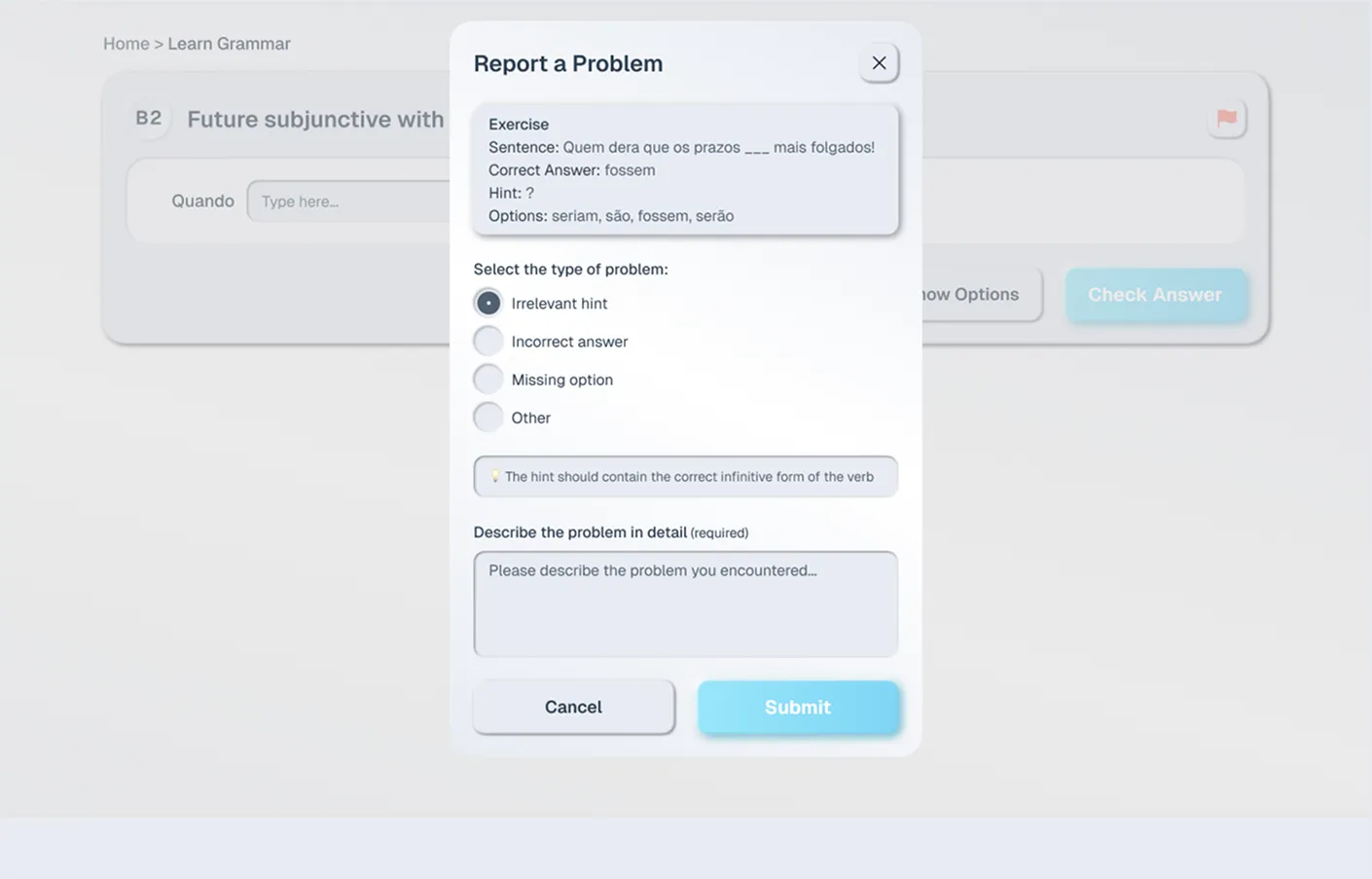 I built dynamic prompts that allowed GPT to generate a wide range of tasks based on topic, level, and user performance. This included fill in the blanks, listening practice, error correction, and short translations.